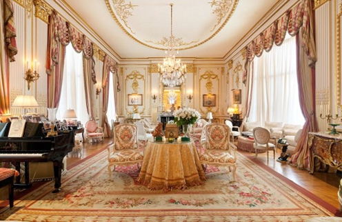 豪華的客廳以柔和的粉紅色作為主調,閃閃發光的吊燈和壁燈是整個廳房的重點,而墻壁上的黃金花卉圖案跟地毯和椅子互相輝映??吹侥桥_漆黑的鋼琴么?這正是客廳畫龍點睛之處。