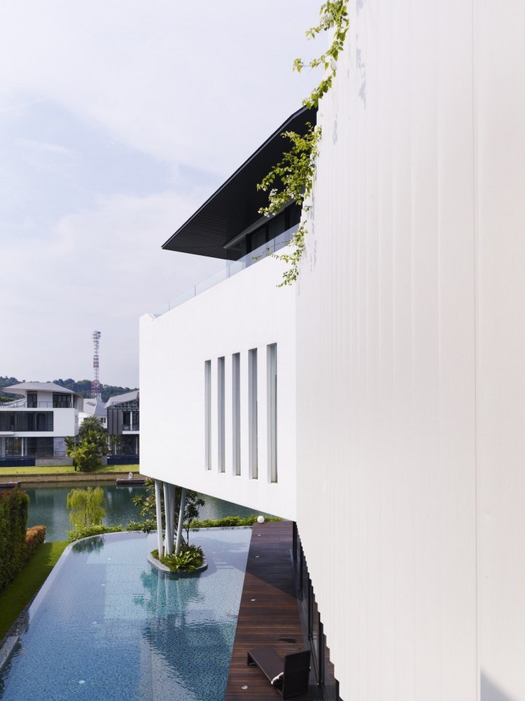 別墅設計,13 Cove Grove別墅(13 Cove Grove)13 Cove Grove別墅建在一處狹長的基地上,正對著一小片水域。為了使居住者最大化地欣賞到水域的風景,設計團隊將別墅裝修設計成一個類似回力鏢的體量,從而使臥室正面像這片美景。這樣的布局安排,使這個游泳池的一邊一直延伸至一層的一側。另外,團隊還在一層的主要區域設計了一個連續性的空間,進入這里后,人們可以看到筆直的水域獲得更加連續的視野。與水域相連的是一個線性的木質甲板設計,一直從房間內部延伸出來,視覺上增加了房屋的面積。除了基本的回力鏢設計,團隊至少還采用了另外兩種布局的變體,從立面設計看,設計師以完全不同的方式設計了不同兩側的回力鏢體量。面向街角的一層,將透明與封閉設計交叉使用,而二層則完全使用了實體墻進行立面設計。靠向水域的一層則采用了相對開放的透明玻璃設計,增強了可視度。一層主要作為公共活動空間,二層為臥室區域,而與屋頂花園相連接的三層則主要作為工作室使用。