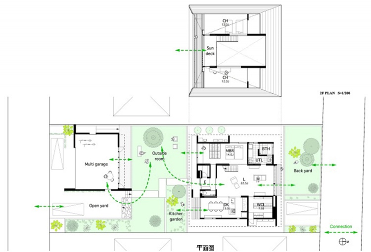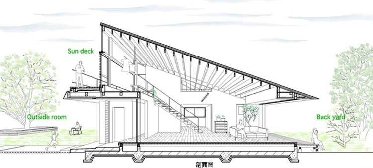 房屋內有一個開放的客廳,與主臥相交,浴室、餐廳、廚房及洗手間位于外部區域??蛷d空間的橫向延伸,通過“天臺”(或陽臺樣中間空間位于內部與外部之間)對外界。生活的空間,可自由分割為必要的滑動門,提供適當程度的隱私和家庭成員聚集地的同時,和日本傳統住宅一樣。