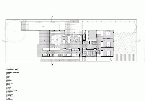設計師以精簡的表達方式,完成了一件戲劇性的別墅建筑,該設計演繹出空間的靈活性,又不失去家庭生活的實用。 這個實用又美觀的住宅外觀平淡無奇,作為一個靈活的家庭生活空間,室內和外部環境的界線用模糊的手法處理,使每個生活空間都和戶外相結合。 該建筑的精巧細致,大膽的直線形式,和植物相映生輝。房子的一側入口實用舊鐵路枕木做成,在地面形成一個有趣的路徑。