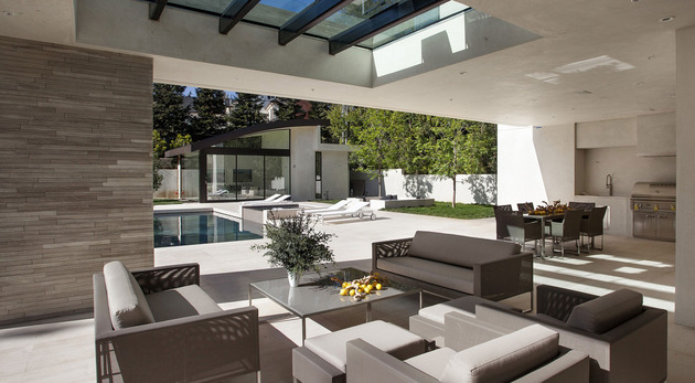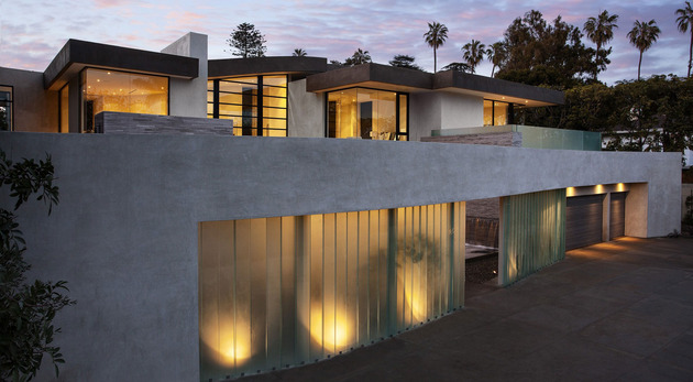 房子位于一條街道,為了減少汽車噪音影響,建筑師用高大的圍墻和大門將庭院與街道隔開,大門兩側(cè)是玻璃百葉,起到緩沖噪音的作用,同時不阻擋光線通過。此外,還設(shè)計了一條路和小橋,將大門和室內(nèi)連接。穿過院子時,可以欣賞水景,也能聽到瀑布墻的流水聲,使人感到非常放松。